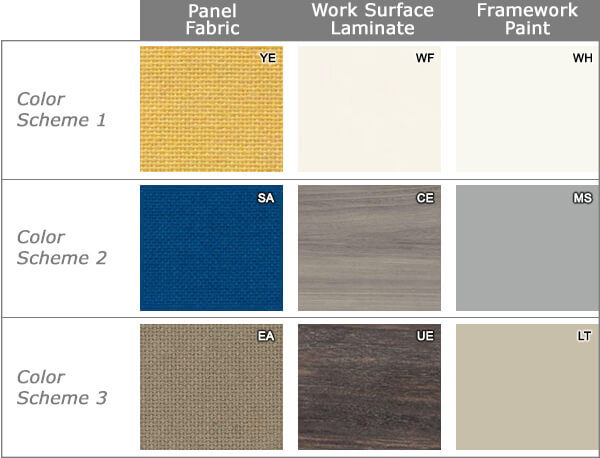 Please consider all factors influencing color perception when choosing panel fabric, work surface laminate, and trim paint colors. Natural or artificial light, time of day, and surrounding hues in your office environment, all can influence one's visual perception of color.